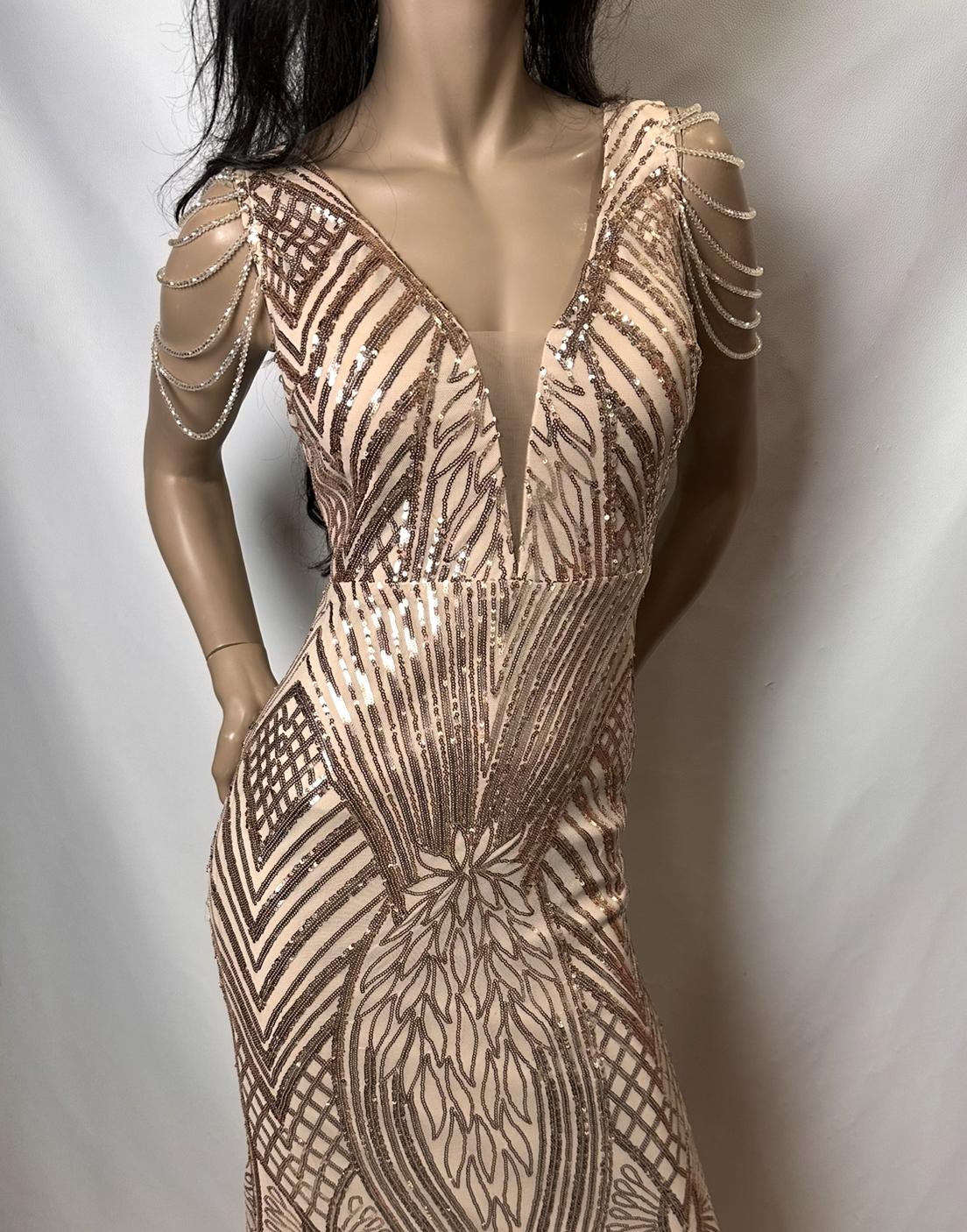 Abito lungo sirena con coda e lavorazione a rilievo in paillettes. Corpetto con coppe preformate e fili di Swarovski che cadono sulle braccia. Ottima vestibilitร